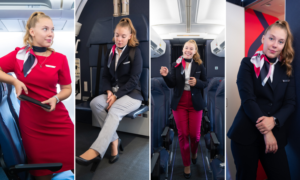 De la robe au pantalon gris, en passant par les pantalons fuchsia et la tenue marine, notre personnel de cabine a du choix!
